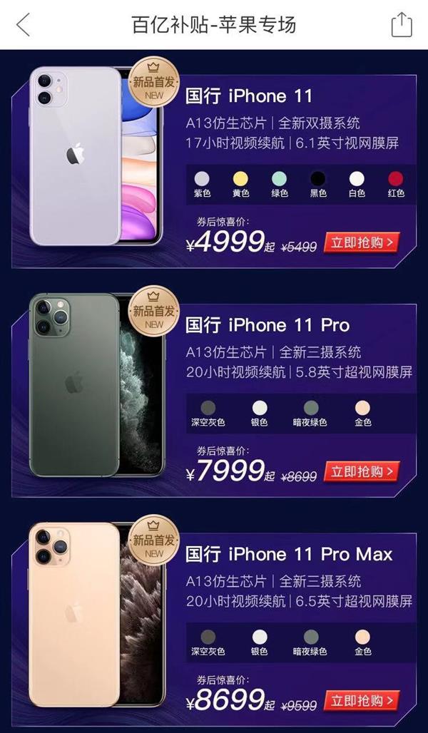 拼多多上的iPhone 11、iPhone 11 Pro和iPhone 11 Pro Max券后起售价分别为4999元、7999元和8699元,均创下新款iPhone全网最低发售价。