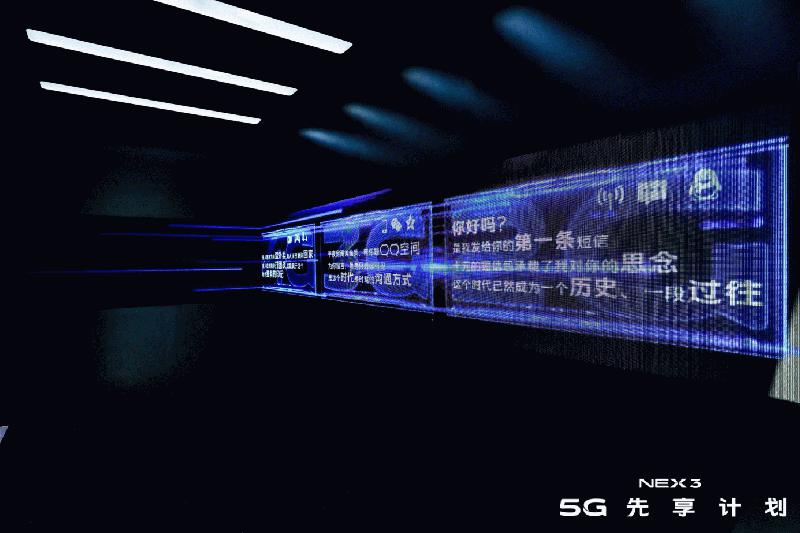 现在,连接着过去和未来。站在传送隧道,两侧的显示屏以文字和视频的形式展示从1G到5G的变化和发展,同时播放NEX 3 5G外观元素的视频,带你感受移动互联网从起步到现在的发展历程,感受科技的温度。