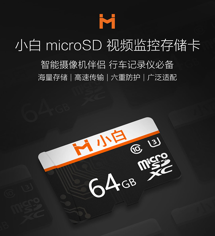 9月28日,小米生态链企业创米科技推出了一款小白Micro SD存储卡,三种版本售价为:32GB版39.9元,64GB版59.9元,128GB版99.9元。小白Micro SD存储卡可录制和播放4K UHD超清视频,32GB读取速度可达95MB/s,64/128GB版读取速度可达100MB/s,3GB视频传输至电脑需38秒。以64GB容量来说,足以支持存储约3小时的4K UHD视频、8小时30分的全高清视频或14000张照片。小白Micro SD存储卡具备6重防护:耐高低温、防水、防尘、防静电、防磁、防机场X光。