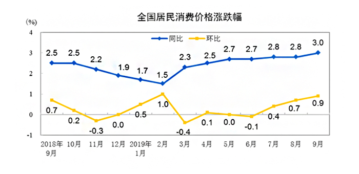 2019年9月份居民消费价格同比上涨3.0%