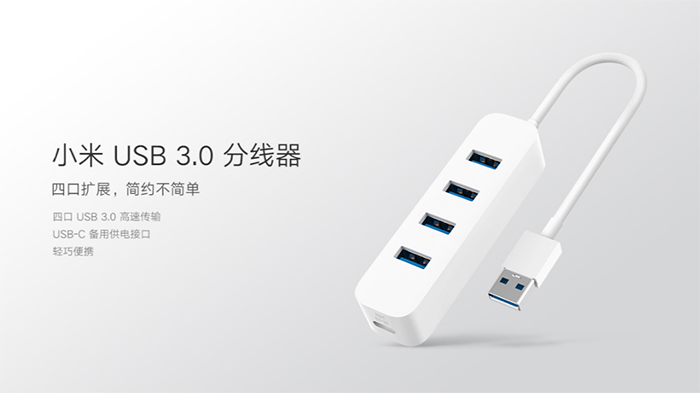 10月18日,小米USB3.0分线器已经上架,售价49元。小米USB3.0分线器搭载四个USB3.0接口和一个USB-C备用供电接口,USB 3.0实际读写速度可达350MB/s,并向下兼容USB 2.0/USB 1.1规格。备用供电采用USB-C接口,支持正反插,反复插拔可达10000次,通用性更强。兼容市面上大部分USB设备连接,例如鼠标、键盘、U盘、移动硬盘等常用USB设备。兼容系统兼容,支持Windows,macOS,Android,Linux系统。小米USB3.0分线器全长约0.24m,重约33g,体积小巧、外观简洁,可轻松放入衣服口袋、背包夹层,携带方便。外壳采用PC材质,经久耐用,弧形边角设计,手感圆润舒适。