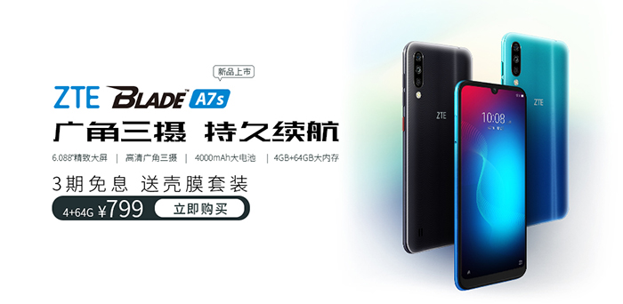10月18日,中兴最新入门手机中兴Blade A7s正式开卖,售价799元。中兴Blade A7s配备6.088英寸HD+水滴屏,19.5:9比例,屏占比达到了89%,有星夜黑和湖光蓝两种配色可选。后置采用了1600万主摄+800万超广角+200万景深三摄设计,120度的大广角。搭载Helio P22八核处理器,4个Cortex A53 2.0GHz+4个Cortex A53 1.5GHz,存储组合为4+64GB,并支持最高512GB存储扩展。内置4000mAh的大电池,配合节电管理技术及省电模式,中度使用两天一充;可连续播放29小时本地音乐,连续15小时网页浏览,连续10小时在线视频播放。搭载更轻更快更纯净的轻量级系统MiFavor 9.1 UI,支持人脸解锁,支持微信/QQ双开等功能。