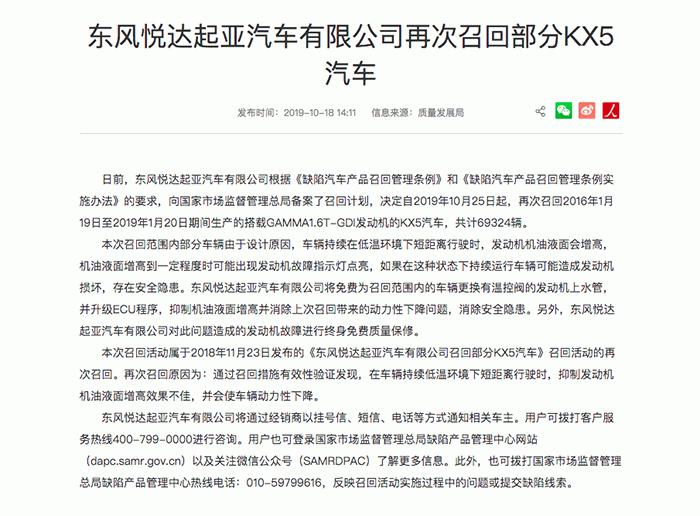 本次召回活动属于2018年11月23日发布的《东风悦达起亚汽车有限公司召回部分KX5汽车》召回活动的再次召回。再次召回原因为:通过召回措施有效性验证发现,在车辆持续低温环境下短距离行驶时,抑制发动机机油液面增高效果不佳,并会使车辆动力性下降。
