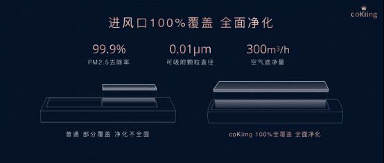 特征4:健康净化。coKiing内嵌高端顶配IFD微静电除尘空气净化系统,不仅PM2.5去除率高达99.9%,甚至可过滤0.01微米的超小颗粒,高效维持健康的居住环境。