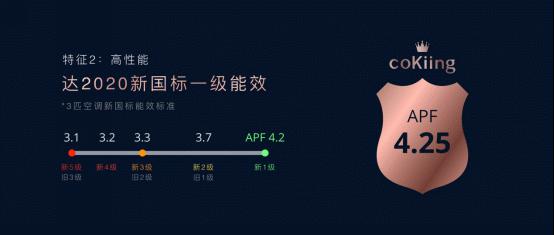 特征2:高性能。值得一提的是,空调业将在2020年迎来极其严格的《单元式空气调节机能效限定值及能效等级》(以下简称2020能效新国标),而coKiing 全新AI变频空调,凭借从外机轴流风扇电机、内机贯流风扇电机到压缩机,全线配置直流变频,专为2020能效新国标打造,并超额将能耗效率标准提升近乎一倍,远超新国标一级能效,节能环保更省心。