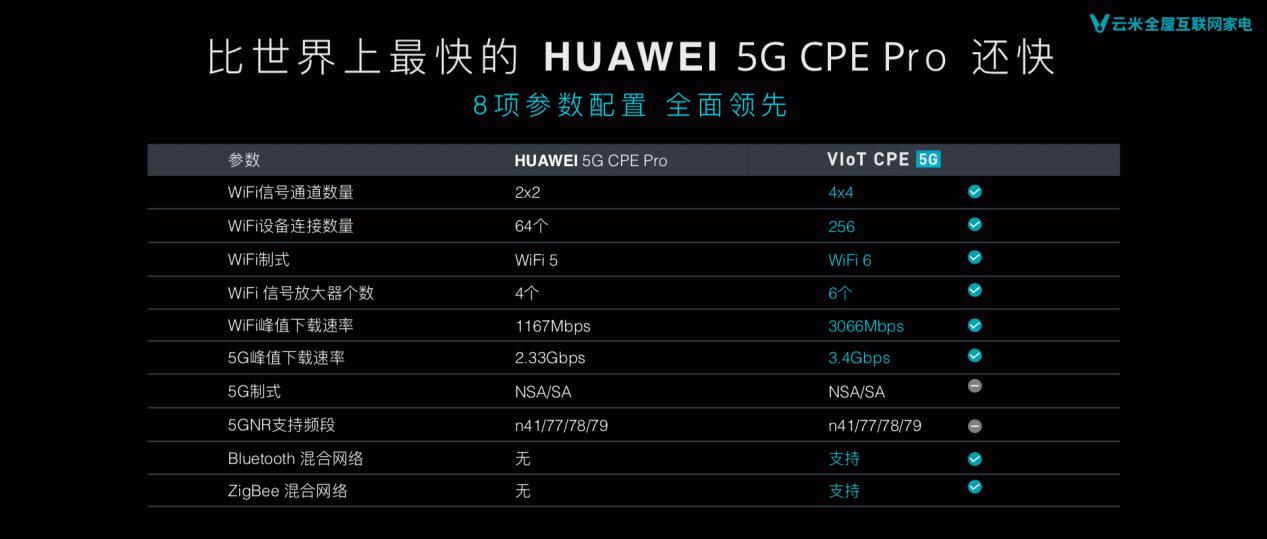 今年的AWE上,云米发布了全球第1台5G 互联⽹冰箱。此次发布会,云米又紧跟华为,推出VIoT 5G CPE。虽是全球第2款5G全网通智能路由器,但在多项核心配置与性能上,VIoT 5G CPE仍实力领跑华为5G CPE。