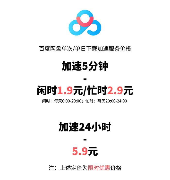 10月23日,百度网盘官方宣布,单次/单日下载加速服务正式上线,PC/手机端均可使用。百度网盘表示,该服务旨在给网盘用户们提供更灵活的加速下载付费模式。网盘在判断非会员用户极速下载试用结束后的网速确实支持高速下载后,将会弹出“延长加速时间”提示,这样就能轻松享受单日/单次下载加速服务了。目前百度网盘单次/单日下载加速服务价格为:加速5分钟闲时需要1.9元(每天0:00-20:00),忙时(每天20:00-24:00)则需要2.9元;加速24小时需要5.9元,该定价为限时优惠价格。