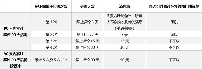 这一产品功能的上线,标志着微博希望通过产品实现用户的自主管理,维护社区秩序,并逐步塑造微博的社区规范和礼仪,是微博为遏制网络不友善言论所做的又一次尝试。 “博主拉黑停止评论”功能上线一年以来,博主管理评论的习惯逐渐深入人心,并且初步形成了通过转发表达不同意见的行为模式。 但是与此同时,“博主拉黑停止评论”功能的缺陷也很明显。尤其是目前只停止三天并且可以自助解封的力度,对于反复骚扰冒犯他人破坏社区秩序的行为不能有效制止,策略亟待升级。 为了解决以上问题,10月23日,微博官方宣布“删除评论并拉黑”功能升级。本次策略升级将以“先教育告知后处罚隔离”为原则,对通过评论反复骚扰和冒犯博主的个别账号在一个时段以内采取再犯从重的处置手段。(见功能说明和表格) 具体说明: 一、每次被不同博主删除评论并拉黑,都会产生记录。根据用户第一次被删评拉黑时起90天内累计的记录,会有不同程度的处置策略,具体如下表。 从第一次被删评拉黑时起,达到90天时如果累计次数≤4次,则累计次数清零。若再次被删评拉黑则从新累计次数。 从第一次被删评拉黑时起,达到90天时如果累计次数≥5次,将持续累计并后续每一次都按最大力度处置。