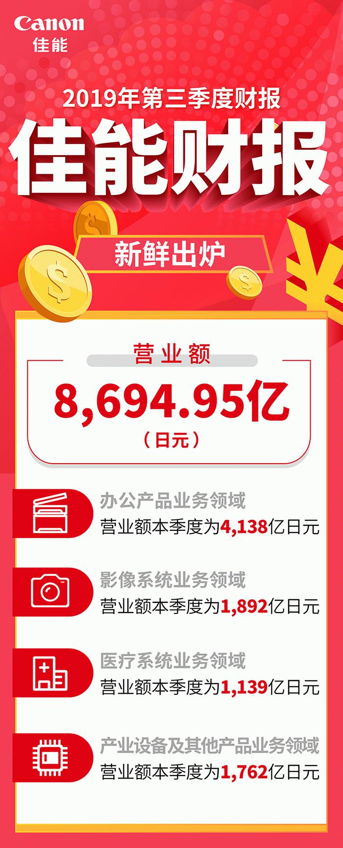 【小熊在线网 新闻报道】2019年10月28日,佳能集团发布2019年第三季度财报。据财报显示,2019年第三季度佳能集团营业额同比降低6.2%,为8,694.95亿日元。其中,医疗系统业务领域持续稳步增长,销售额对比去年同期增幅达5.9%。彩色数码复合机与节能环保的高性能激光打印机销售增长明显,面向生产型数码短版印刷市场的新产品获得市场好评,全画幅专微相机市场表现持续走高。
