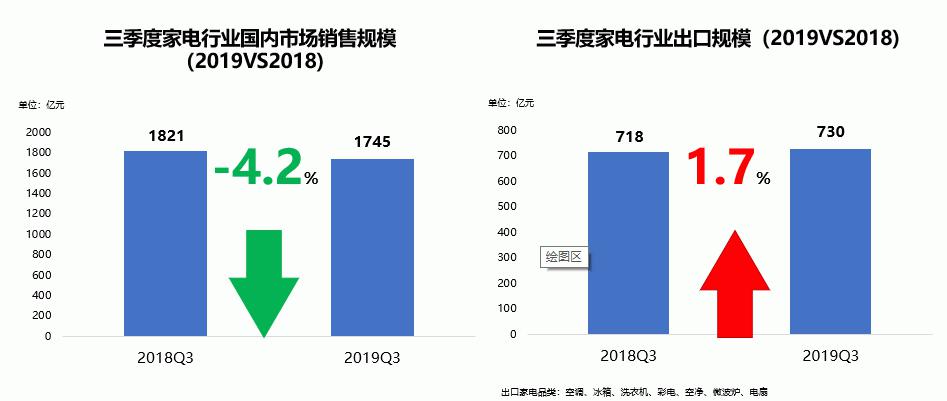 全国家用电器工业信息中心研究员杨征对三季度报告进行了解读。报告显示,2019年三季度,国内市场销售额1745亿元,同比增长率-4.2%。出口方面则保持着增长的势头,但增长幅度收窄,2019年三季度家电出口额730亿元,同比增长率为1.7%。