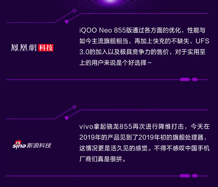 iQOO Neo 855版另外一大卖点就是33W闪充和4500mAh超大电池组合,只需10分钟即可充入4500mAh超大电池的25%,而4500mAh超大电池则可以持续看抖音12.5小时,玩王者荣耀(高帧率)7.14 小时,听90小时歌曲,真正实现了回血迅速、续航持久1,彻底解决用户的电量焦虑症。对于iQOO Neo 855版的具体表现,媒体口碑多集中在“真香”、“性能强悍”、“标杆”、“跑分王”、“全面”等关键词,足可见这款“855新王牌”的强悍实力。