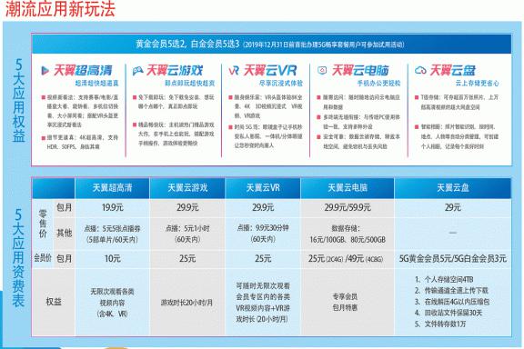 在本次电信5G商用发布会上,5G套餐的发布可谓是亮点多多。套餐涵盖129-599元多个档位,可满足学生、上班族、商务、潮流玩家等不同人群的流量需求。同时,办理电信5G套餐还可以享受会员专属权益,如云VR、云游戏、云电脑、超高清、天翼云盘、爱奇艺、优酷视频、腾讯视频、酷狗音乐、QQ音乐、全民K歌等,可自由灵活选择,享受VIP会员折扣价。