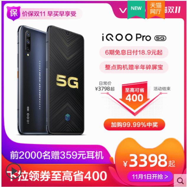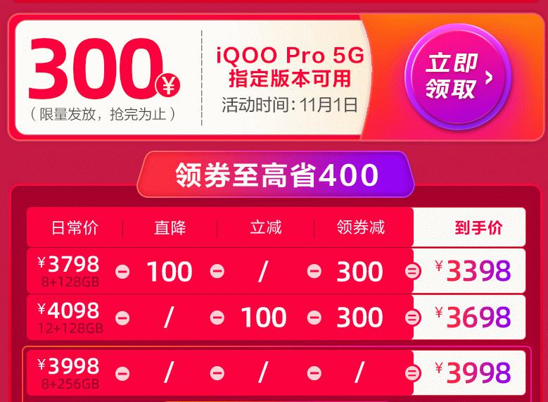 11月1日到11月2日,在京东、天猫、苏宁、vivo官方商城等平台,购买iQOO Pro 5G版手机的用户,限时优惠100元,还可以再领300元优惠券,8G+128G原价3798元,限时优惠价3398元;12G+128G原价4098元,限时优惠价3698元。另外,再送价值359元的W7蓝牙耳机,还有6期免费分期、半年碎屏宝赠送。