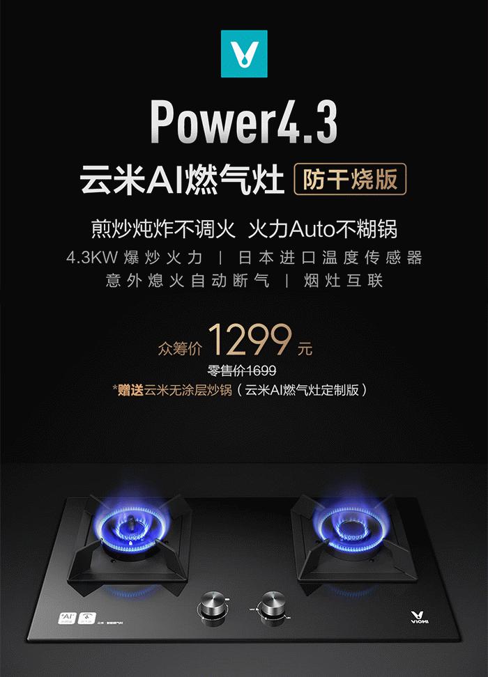 11月2日,小米有品众筹上架云米AI燃气灶Power4.3(防干烧版),提供天然气、液化气两种可选众筹价1299元起,未来零售价1699元起。云米AI燃气灶Power4.3(防干烧版)拥有4.3KW的爆炒火力,配备的智能防干烧功能可以自动关闭机器,用户即使忘记关火也不用怕。搭载日本立山温度传感器,智能感应锅内温度,结合云米A智能算法,实时判断锅内食材类别和烹饪方式,自动调节菜肴所需火力大小,保证不糊锅,菜肴口感更佳。此外,燃气灶还配有烟灶互联功能,云米AI燃气灶一开,云米烟机自动开启,及时排走油烟,风随火动,火力变大,风力自动变大。