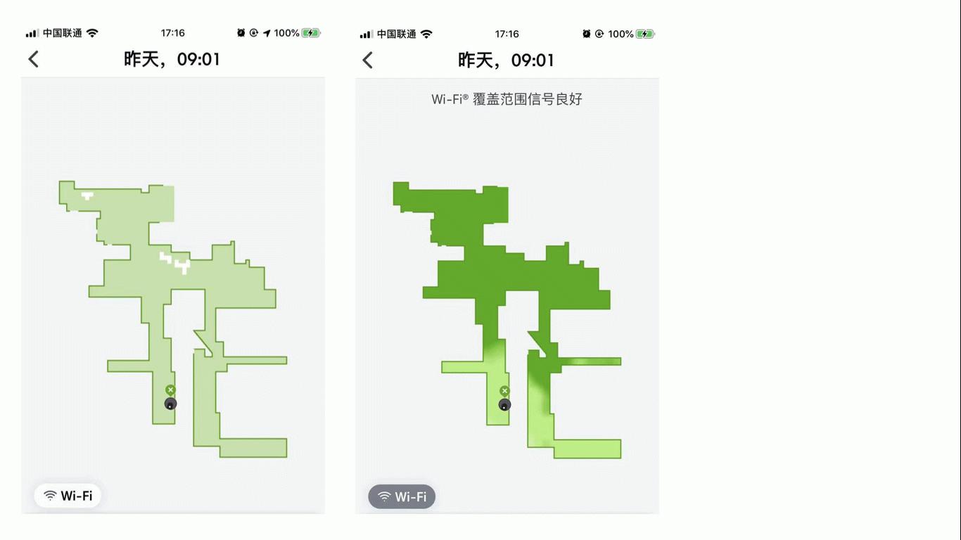 此次推出的Wi-Fi覆盖地图功能,实现了iRobot Roomba 9系扫地机器人检测用户家中无线信号强度的功能,从而可以帮助用户发现家中Wi-Fi覆盖较弱的区域。基于这一信息,用户可以采取相应的信号优化措施。用户只需正常启用Roomba 扫地机器人,机器人即可在清洁过程中收集Wi-Fi信号情况。待清洁任务完成后,用户将会接收到关于Wi-Fi覆盖地图生成的提示。用户只需在iRobot HOME应用程序中的Clean MapTM清洁报告页面,选择左下角的“Wi-Fi”地图模式即可切换浏览Wi-Fi覆盖地图。