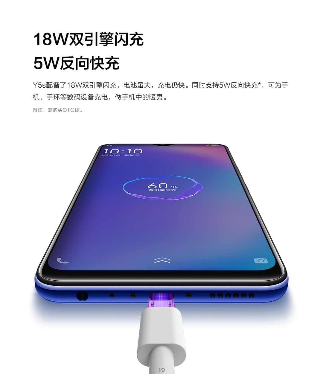 在充电上,vivo Y5s配备了18W双引擎闪充,即使是5000mAh超大容量电池,也能拥有不错的充电体验,在没电时能够快速恢复电量。此外,vivo Y5s还支持5V/1A反向快充,在身边智能设备没电时,能够化身临时充电宝,为智能设备充电。