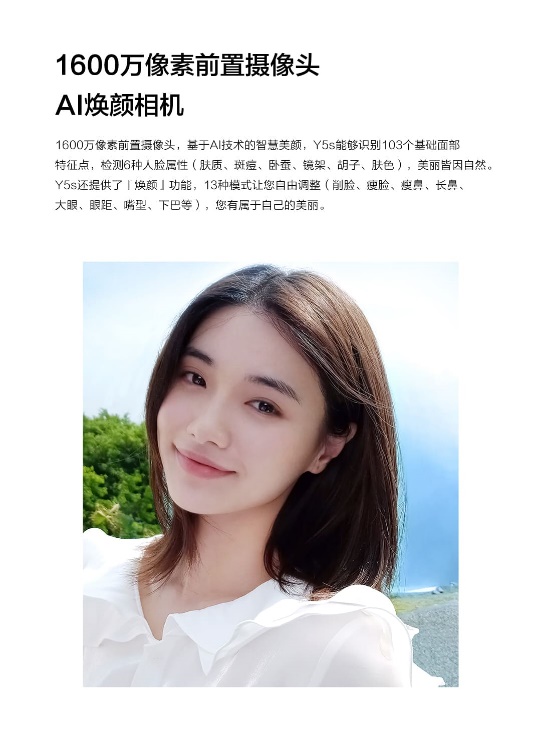 vivo Y5s前置采用1600万像素的自拍镜头,加入了基于AI技术的智慧美颜,能够自动识别人物的103个面部特征和检测6种人脸属性,使自拍效果更加自然。同时加入了“焕颜”功能,提供13种模式自由调整面部容貌,打造出独特的美。vivo Y5s的前置摄像头还支持人脸识别,配合后置电容指纹,带来全新的解锁体验。