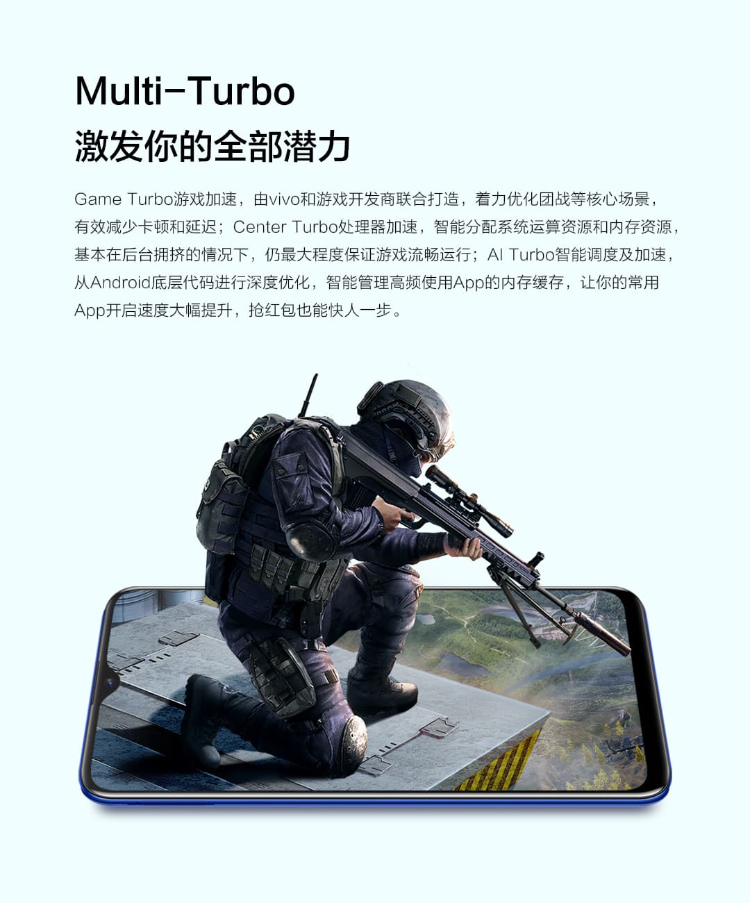 游戏上,vivo Y5s此次搭载的游戏魔盒全新升级,带来更沉浸的游戏体验,后台挂机、电竞模式2.0让游戏体验更出色;而vivo Multi-Turbo多涡轮加速引擎则能激发手机的游戏潜能。