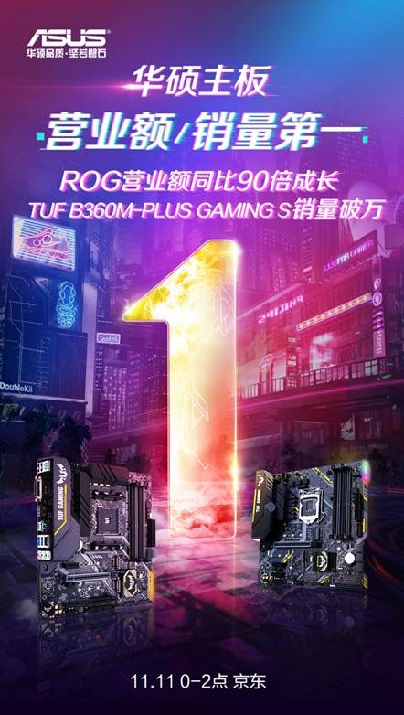 今年双11的活动中,华硕主板依旧强势制霸各大榜单,以绝对优势斩获全网营业额第一、京东销量第一,成绩斐然!同时旗下子品牌ROG玩家国度主板更是大幅度成长,营业额同比增长近2倍;另人气爆款华硕TUF B360M-PLUS GAMING S主板表现更为亮眼,不仅勇夺营业额、销量全网第一,其销量更是同芯片组第二名的3倍!华硕主板以数据说话,凭实力彰显了其领导地位!