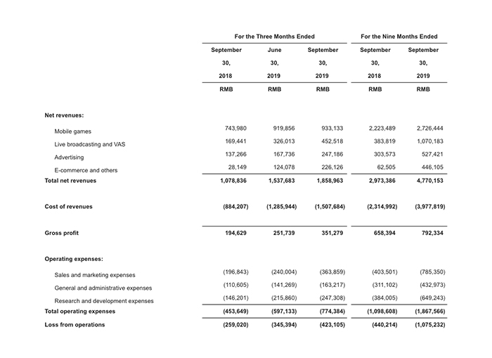 11月19日,哔哩哔哩公布了截至2019年9月30日的第三季度未经审计的财务报告。本季度内,总营收达18.6亿元人民币,同比增长72%。游戏业务收入同比增长25%至9.3亿元,非游戏业务收入同比高速增长176%达9.3亿元,占总营收比重50%。直播和增值服务业务收入达4.5亿元,同比增长167%。品牌推动三季度广告收入增长80%至2.5亿元。电商及其他业务收入达2.3亿,同比增长703%。月均活跃用户达到1.28亿,同比增长38%;移动端月均活跃用户破亿,同比增长43%达1.14亿,在此基础之上,日活用户创新高至3760万,同比增长40%。月均付费用户数同比高速增长124%,达到795万。付费会员业务方面,截至9月底,大会员数量同比增长129%达610万。用户日均使用时长达83分钟;日均视频播放量达7.25亿次,月均互动数达25亿次,分别同比提升60%和122%。月均活跃UP主及其投稿量分别同比增长93%和83%,达到110万及310万。