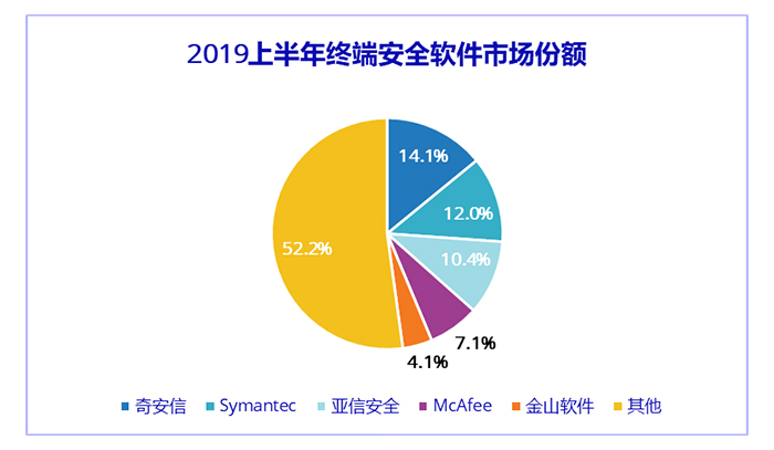 伴随着中国云计算市场的快速发展,云平台及云租户的网络安全需求不断提升,促进了安全软件市场的整体增长。同时,监管部门和重点行业持续加强对态势感知平台及相关解决方案的建设,与分析、情报、响应、编排相关的安全产品得到更广泛应用。新兴业务场景的安全需求旺盛,共同带动了2019年上半年中国IT安全软件市场的较快增长。市场分析机构IDC发布的最新研究报告显示,2019年上半年中国IT安全软件市场厂商整体收入为4.82亿美元,约合人民币32.7亿元,同比增长16.48%。预计中国IT安全软件市场厂商收入2023年将达到29.2亿美元,约合人民币198.2亿元,未来5年整体市场年复合增长率(CAGR)为25.6%。其中,终端安全软件市场份额方面,奇安信、Symantec、亚信安全、McAfee、金山软件位列前五位。