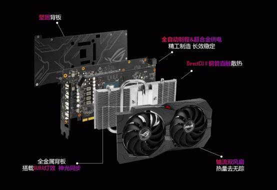 ROG STRIX GeForce® GTX1650 SUPER™显卡还拥有专为新一代高端的ROG 电竞显卡而设计的轴流风扇,其采用更小的风扇壳以容纳更长的扇叶,并以环形密封环提高向下气压,可以获得更好的散热效果。支持0dB技术,可在GPU核心温度维持在55°C以下时,完全停止风扇,让玩家在低噪音的情况下畅玩初级游戏,温度上升时风扇会自动重新启动。