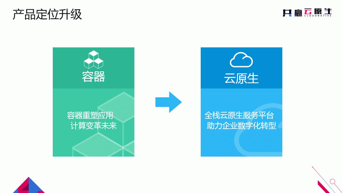 最后,通过本次大会时速云CEO黄启功正式宣布产品战略升级,在激烈的行业竞争中寻找差异化竞争优势,完成从容器云到云原生产品体系的转变。从“容器重塑应用、计算变革未来”,升级为打造“全栈云原生服务平台,助力企业数字化转型”。