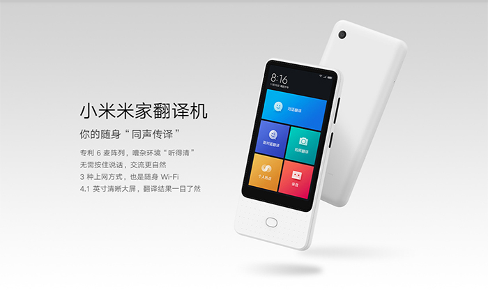 11月22日,小米米家翻译机发布,将于11月26日10点首卖,价格为1299元。小米米家翻译机采用4.1英寸触摸屏,像素密度为357PPI,翻译结果显示清晰。内置3000mAh电池,充满1次19天超长待机,支持5小时连续翻译。有3种上网方式:实体SIM卡、Wi-Fi热点、虚拟卡,在世界各地轻松联网。并可创建热点共享网络,同时分享给6台设备。支持18种语言互译,语种覆盖170多个多家和地区。搭载800万像素自动对焦高清相机,支持8种语言在线拍照翻译,实景即拍即译。使用6麦克风阵列技术,实现双向拾音、自动判断说话人方向、屏蔽机身左右两侧噪音。进入“对话翻译”界面,可自动拾音、自动断句、自动翻译、自动显示并播放翻译结果。录音功能可自动转文字,方面在手机和电脑上管理和编辑。