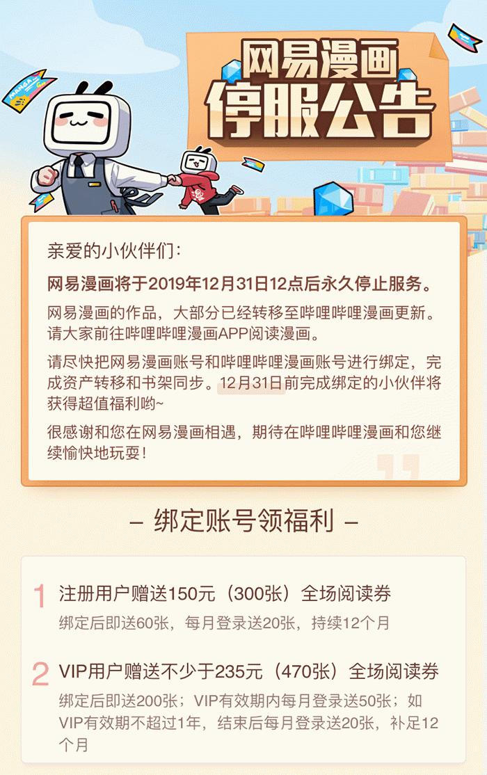 11月27日,网易漫画宣布将于2019年12月31日12点后永久停止服务。官方表示,网易漫画的作品大部分已经转移至哔哩哔哩漫画更新,大家可前往哔哩哔哩漫画APP阅读漫画。需要注意的是,用户尽快把网易漫画账号和哔哩哔哩漫画账号进行绑定,完成资产转移和书架同步,12月31日前完成绑定的用户将获得超值福利(2019年11月11日11:00后注册的账号,不享有绑定福利,资产仍可正常转移)。绑定账号可领取以下福利:1、注册用户赠送150元(300张)全场阅读券;2、VIP用户赠送不少于235元(470张)全场阅读券。完成绑定后的账号将会清空账号内的钻石、钻石券、金币,同时保留已购章节,可继续阅读。