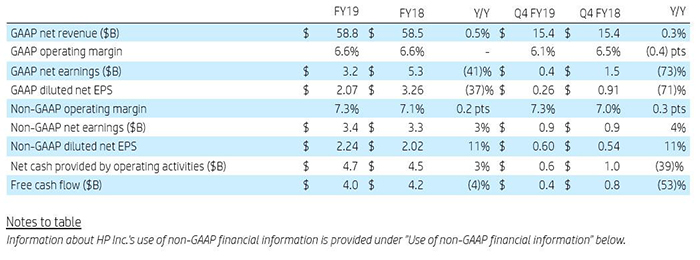 在整个2019财年,惠普的净营收为588亿美元,比2018财年的585亿美元增长0.5%,不计入汇率变动的影响为同比增长2.0%。惠普2019财年净利润为32亿美元,比2018财年的53亿美元下降41%。惠普2019财年的每股摊薄收益为2.07美元,比去年同期的3.26美元下降37%。不按照美国通用会计准则,惠普2019财年的调整后净利润为34亿美元,比2018财年的33亿美元增长3%;调整后每股收益为2.24美元,比去年同期的2.02美元增长11%。惠普2019财年的运营利润率为6.6%,与2018财年的6.6%相比持平。不按照美国通用会计准则,惠普2019财年的运营利润率为7.3%,比2018财年的7.1%上升0.2个百分点。