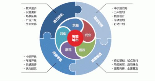 报告指出,智能城市总体推进的战略步骤包括四大核心环节:规划引领、统筹推进、评估考核和迭代优化。智能城市发展核心内容包括兴业、惠民、善政、共生和筑基五方面。以下简单阐述了各个方面的核心内容。
