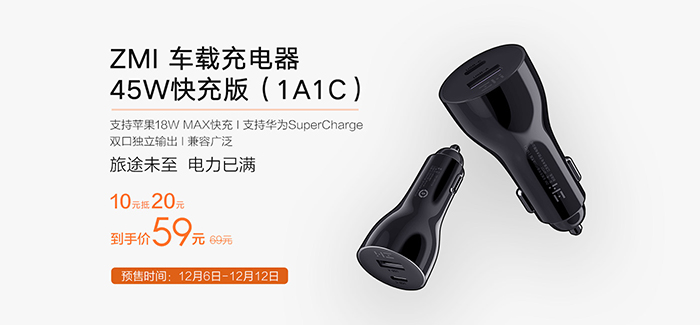 12月6日,紫米QC3.0车载充电器开启预售,售价为69元,预售价为59元。紫米QC3.0车载充电器采用黑色外观设计,机身阻燃PC材质,一体化注塑工艺。双侧金属弹性触点,可有效防震不易脱落,接触更稳定。进口主控芯片,多重电路保护,具有过流保护、短路保护、过压保护和温度保护。双口独立输出,同时输出最大功率可达45W。内置智能识别芯片,自动适配不同设备,有效输出合适功率,兼容小米、苹果、华为等多款设备,还可以给Switch等游戏设备快速充电。