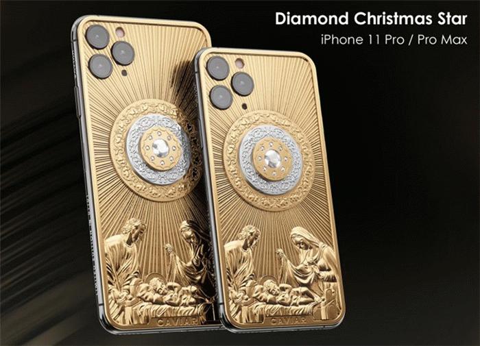12月11日,俄罗斯奢侈品制造商Caviar推出iPhone 11 Pro/Max圣诞节定制版——“圣诞之星”。共有三个版本——钻石圣诞之星、银色圣诞之星、Glow圣诞之星。钻石圣诞之星版是由钻石+金色浮雕组成。机身背面镶有一颗直径1厘米的钻石,代表着圣诞之星,也被称为伯利恒之星。机身外壳由18K黄金制成,刻有耶稣降世的黄金浮雕,仅限一台,售价128050美元起。银色圣诞之星限量发售99台,机身背部和耶稣浮雕材质为925纯银,中间浮雕材质为复合宝石且镶有钻石,起步价9320美元。Glow圣诞之星是三个版本之中最便宜的,起步价6360美元。