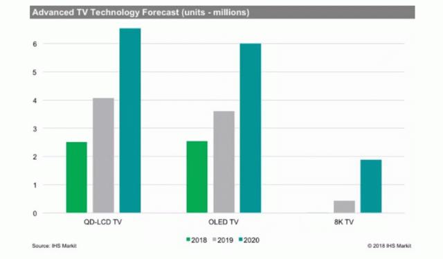随着5G时代的来临,数据传输速度得到了巨大提升,电视清晰度也逐渐开始了由4K到8K的转变;加上电视大屏化趋势,唯有清晰度更高的8K分辨率才能相匹配。据商业信息提供商IHS Markit统计,2019年8K电视全球出货量突破了30万台,是2018年出货量的4倍有余。