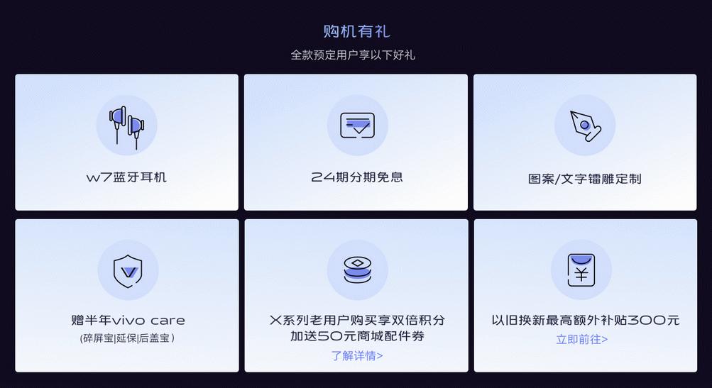 值得一提的是,现在全款购买vivo X30系列的用户均可享受赠送W7蓝牙耳机、赠半年vivo Care(碎屏宝/延保/后盖宝)、图案/文字镭雕定制、24期分期免息、以旧换新最高300元的额外补贴等多重福利。
