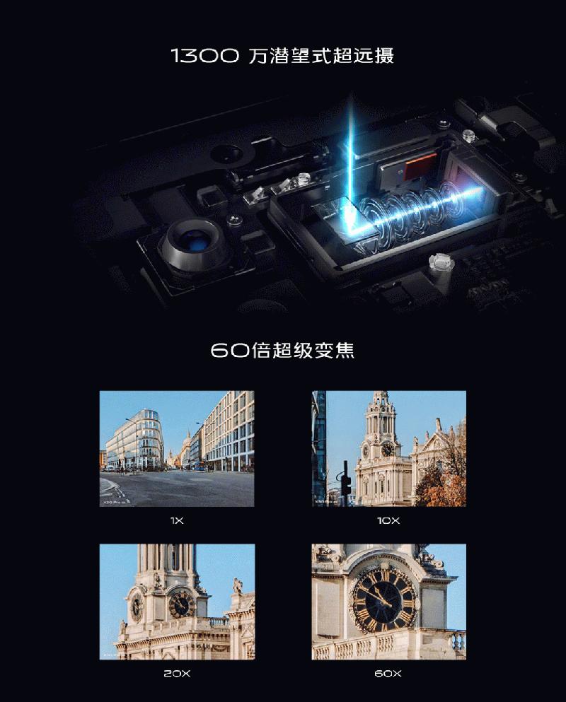 作为专业影像旗舰,vivo X30 Pro采用全新四摄镜头组合。其中,1300万像素的5倍潜望式长焦镜头在vivo自主研发的超分算法加持下,可实现将潜望式长焦镜头的画面放大倍率提升至目前行业领先的60倍。