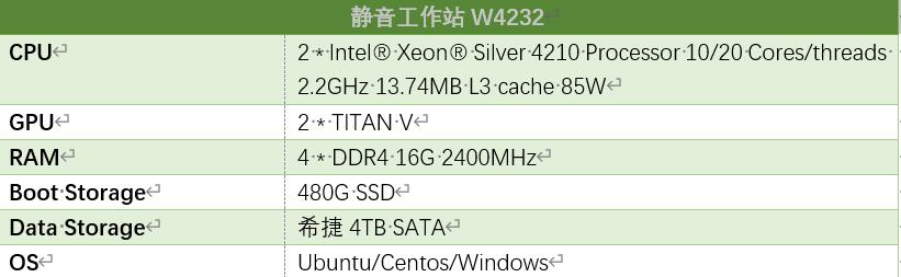 联泰集群W4232工作站采用10核20线程的Intel 可拓展处理器4210处理器,搭载NVIDIA TITAN V显卡,同时还有512GB的M.2的NVMe SSD,同时还包括480GB的SSD,所以整个工作站的性能似乎非常高,基本能够满足市面上大部分的图形渲染,小型仿真分析的工作以及基本的入门的深度学习的开发工作。
