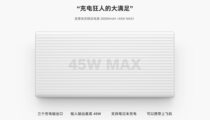 1月1日,坚果20000mAh快充移动电源在锤子商城官网正式开售,售价249元。外观采用白色条纹机身设计与PC+ABS材料外壳,尺寸为152.5×73×25.5mm,重432g。支持QC3.0、PD3.0等多种主流快充协议,配备1个充电输入口(最高45W的输入功率)和3个充电输出口,其中1个为Type-C接口(输入输出最高45W),两个为USB-A接口(最高功率可达18W),可为多个电子设备充电。配备5颗LED指示灯,可显示电量状态。