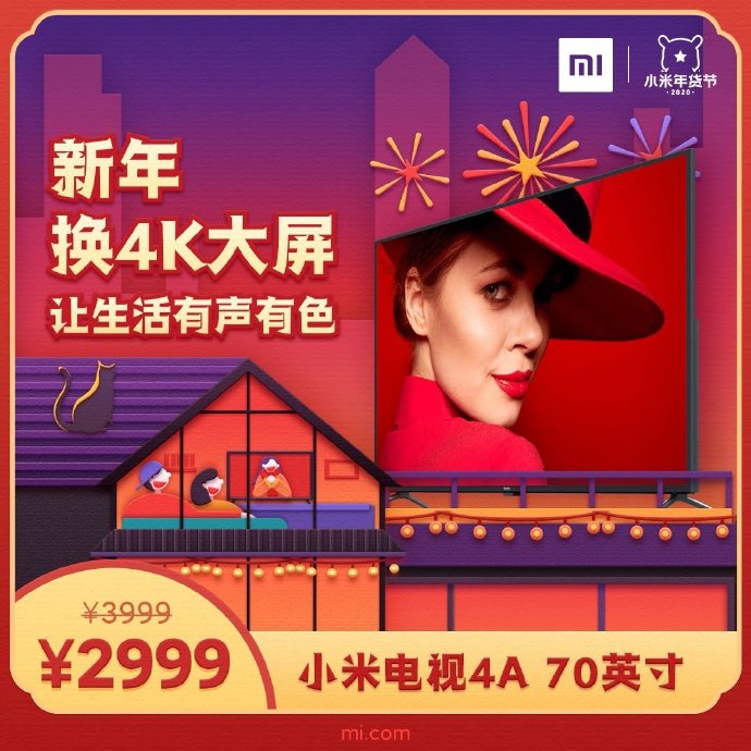 现在购置一台大屏电视,成为许多人新年年货的首选,小米电视超值特惠,总有一款是你想要的,小米电视4A 70英寸作为一款老人小孩都会用的人工智能语音电视, 小米年货节价格低至2999元,超值划算,今年过年换大屏看春晚,可以安排上了!