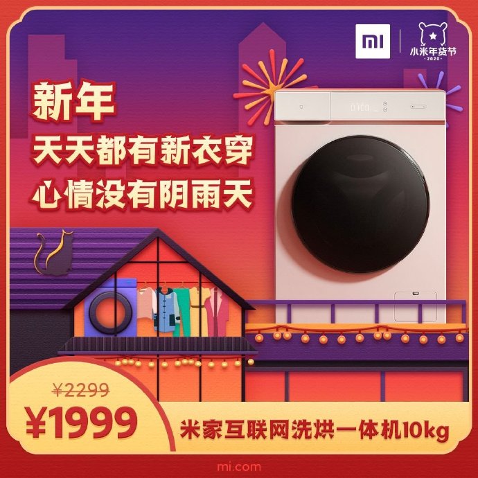 小米年货节,多款家电钜惠,惊喜好价值得买,米家互联网洗烘一体机 10kg,国标最高A+级洗净能力,洗得净、烘得干,只要一台就可以搞定全家衣物,年货节到手价只要1999元。