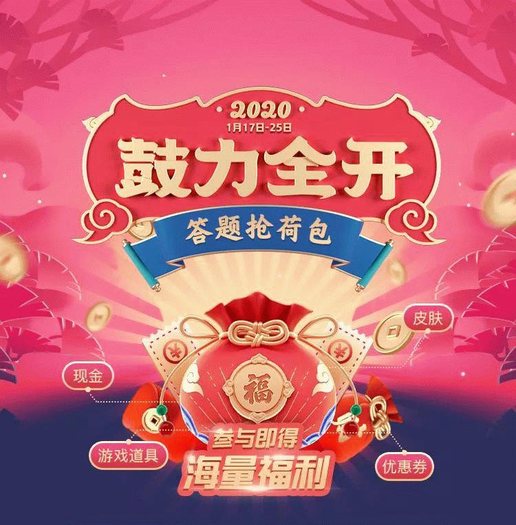 1月15日,腾讯QQ公布了2020年春节红包活动方案。今年的QQ红包玩法为答题抢荷包,名为“鼓力全开”,将于小年、除夕、初一(1月17日、1月24日、1月25日)三日在手机QQ上线,包括现金红包、游戏皮肤、优惠券等。届时,用户点击手机QQ消息窗口的右上角吊坠,或者下拉小程序入口,从顶部活动图便可进入“鼓力全开”活动。题目一共15道,以成语、对联等形式出现,其中空缺的字需要用户从飘落的字里选择。答题结束后,只要不是零分,就可以点击“立即领取奖励”开奖。