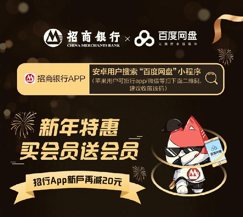 1月15日,百度网盘官方发布新年特惠。据悉,百度网盘联合招商银行APP推出新年特惠礼包,礼包一:百度网盘超级会员1个月+优酷VIP会员1个月=21.6元。礼包二:百度网盘超级会员1年+百度文库VIP会员1年=288元。礼包三:百度网盘超级会员1年+京东Plus会员1年+爱奇艺VIP会员6个月=308元。礼包四:百度网盘超级会员1年+百度文库VIP会员1年+爱奇艺会员6个月=308元。招商银行APP新用户绑定银行卡、信用卡可再减20元,同时可参与抽奖(100%中奖),可与首单优惠价叠加使用。百度网盘会员特权包括5T超大空间、极速下载、视频倍速播放、视频播放高速通道、单次转存5万文件、在线加压8GB内压缩文件、手机视频备份、广告特权、音频倍速播放、回收站有效期30天等等。