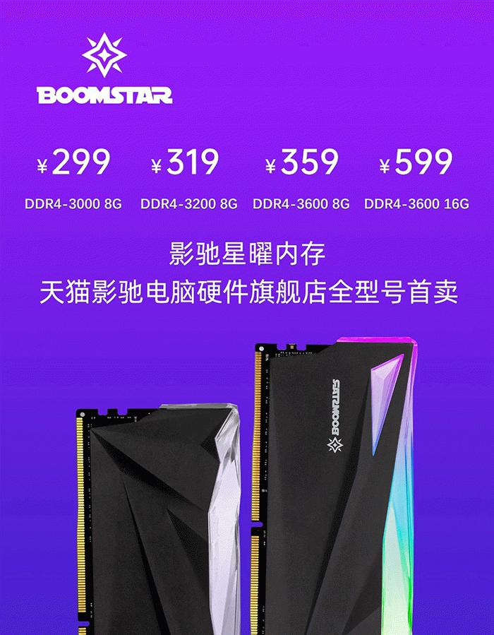 影驰官方宣布,即日起,BoomStar星曜系列内存全型号在天猫影驰旗舰店上线开卖,除了单条8GB还特别新增了单条16GB。影驰星曜内存配备黑色磨砂质感、多种工艺打磨的铝合金散热器,钻石切割设计的透明导光罩,采用高亮LED灯珠搭配钻石切割透明导光棒,1680万色,默认极光灯效,兼容华硕、华擎、微星、技嘉四大品牌的灯光调控软件,可以随时自定义。性能方面,影驰星曜内存精选SK海力士、美光的高品质超频颗粒,搭配八层A2版PCB电路板、镀金层金手指,支持3000MHz、3200MHz、3600MHz三种高频率,还可以进一步超频,时序最低16-18-18-38、最高18-22-22-42,电压1.35V。价格方面,DDR4-3000 8GB 299元,DDR4-3200 8GB 319元,DDR4-3600 8GB 359元,DDR4-3600 16GB 599元。