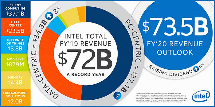 在整个2019财年,英特尔的营收为720亿美元,与2018财年的708亿美元相比增长2%;净利润为210亿美元,与2018财年的211亿美元相比基本持平;每股收益为4.71美元,与2018财年的4.48亿美元相比增长5%。不按照美国通用会计准则,英特尔2019财年调整后净利润为218亿美元,与2018财年的215亿美元相比增长1%;调整后每股收益为4.87美元,与2018财年的4.58美元相比增长6%。