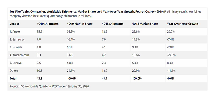 2019第四季度全球平板电脑市场 苹果 三星 华为前三