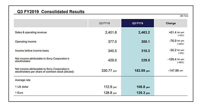 索尼发布2019财年Q3财报 电视手机销售下滑