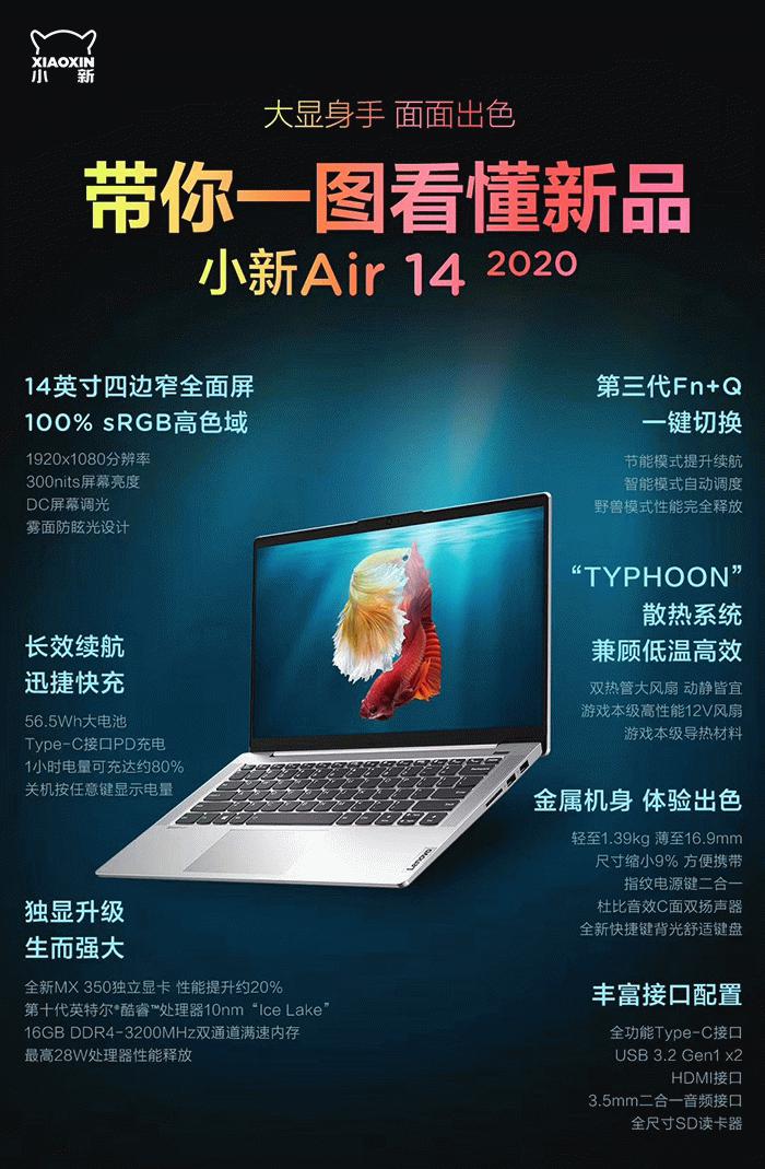 小新Air 14 2020采用金属机身,轻质1.39kg,薄至16.9mm,方便携带。14英寸四边窄全面屏,分辨率1920×1080,覆盖100%sRGB色域,DC调光,雾面屏防眩光设计,前置物理防窥摄像头。搭载了第十代酷睿处理器,有i5-1035G1和i7-1065G7可选,均是四核八线程设计,内存为16GB双通道DDR4 3200MHz内存。显卡为NVIDIA MX350独立显卡 GP107核心、640个流处理器、频率1354-1468/7088MHz,较MX250性能提升约20%,图像处理性能提升了2倍,Pr视频处理性能提升了2.7倍。采用TYPHOON散热系统,12V高性能大体积风扇、双热管,兼顾低温和高效。内置第三代Fn+Q一键切换,节能模式提升续航、智能模式自动调度、野兽模式性能完全释放。电池为56.5Wh大电池,Type—C接口PD充电,1小时可充约80%电量。配有指纹电源键二合一,杜比音效C面双扬声器,全新快捷键背光舒适键盘。接口方面有2个USB 3.1 Gen 1接口,1个全尺寸SD卡插口,1个全功能Type—C接口,1个HDMI接口和3.5mm二合一音频接口。