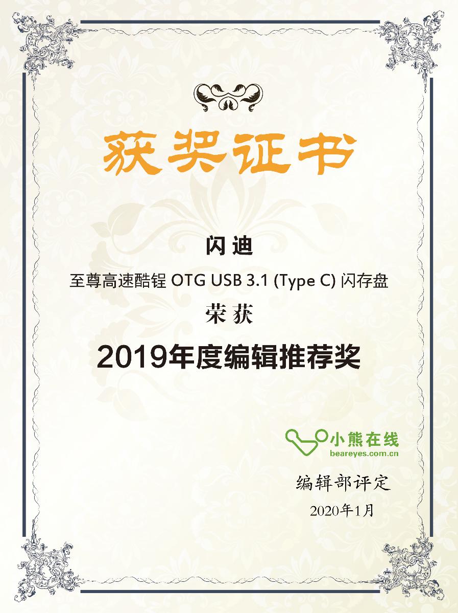 综上所述,2019年度存储类别产品,经过小熊在线编辑部一致评定,闪迪至尊高速酷锃 OTG USB 3.1 (Type C) 闪存盘荣获编辑推荐奖。