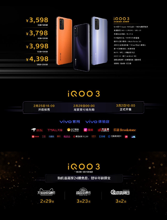 iQOO 3将于2月25日(也就是今天)16:00开启预售,2月29日00:00支付尾款抢先购,3月2日10:00正式开售。