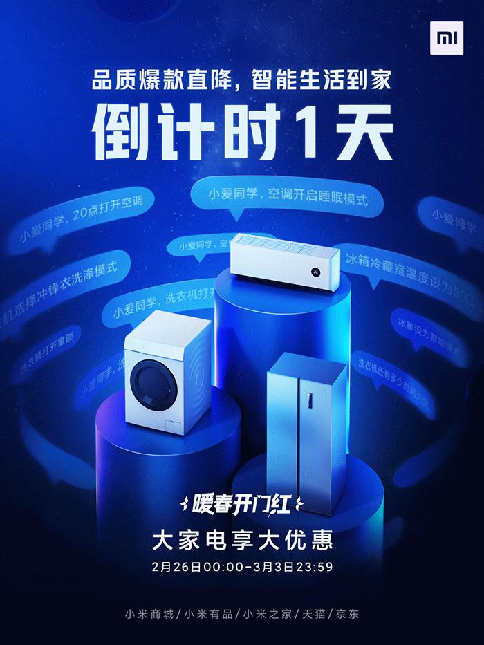 【小熊在线网 新闻报道】2月26日——3月3日,小米将在小米商城/小米有品/小米之家/天猫/京东开启“暖春开门红”活动,包括小米/米家互联网空调、米家冰箱、米家洗衣机在内的多款大家电将迎来优惠,全场最高直降700元,优惠力度仅次于2019年双十一售价。